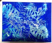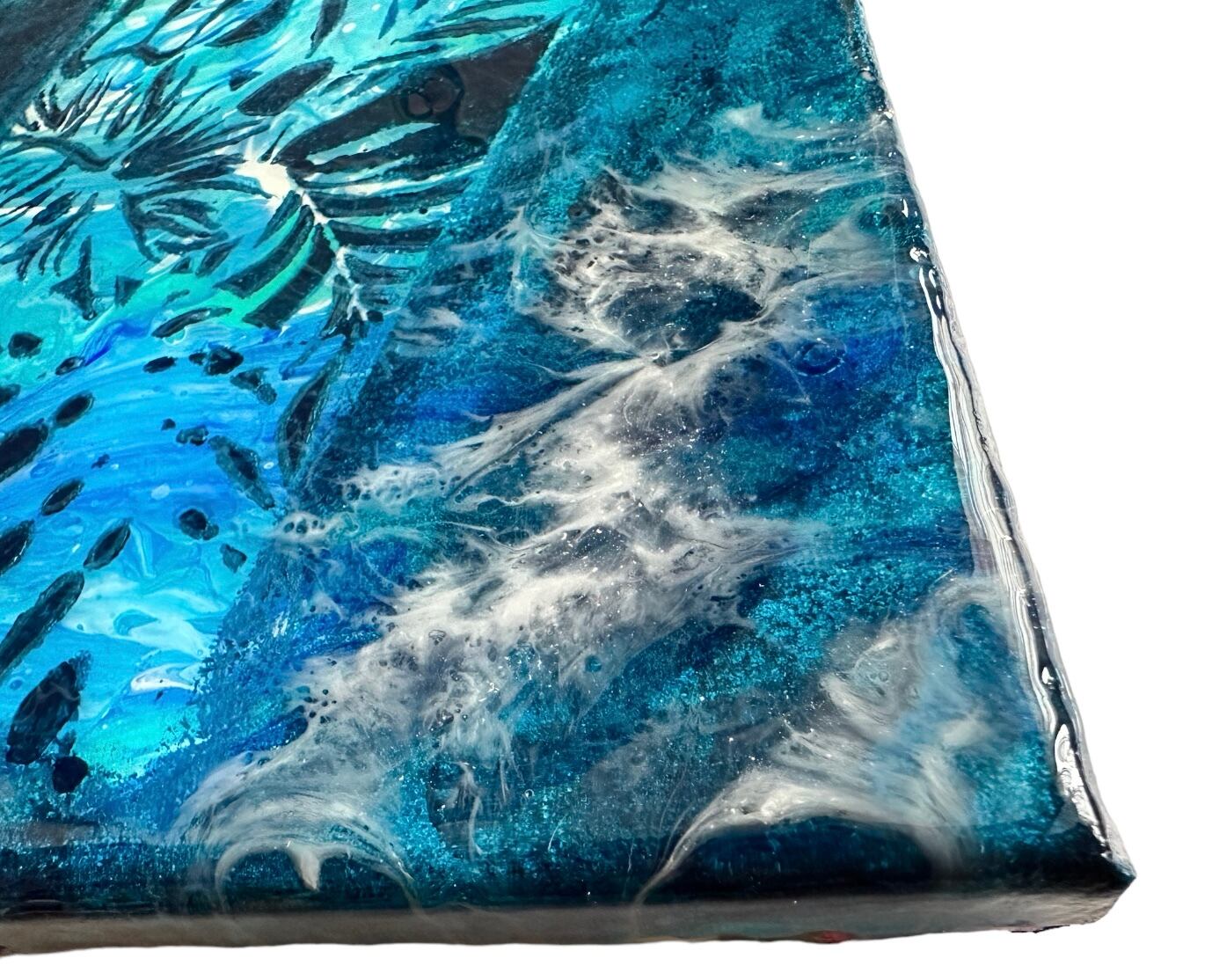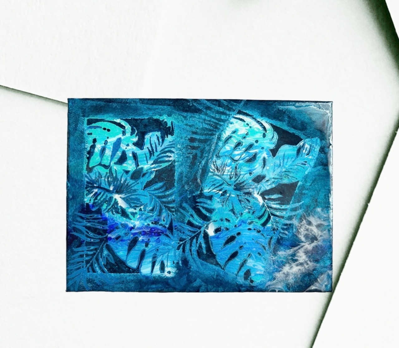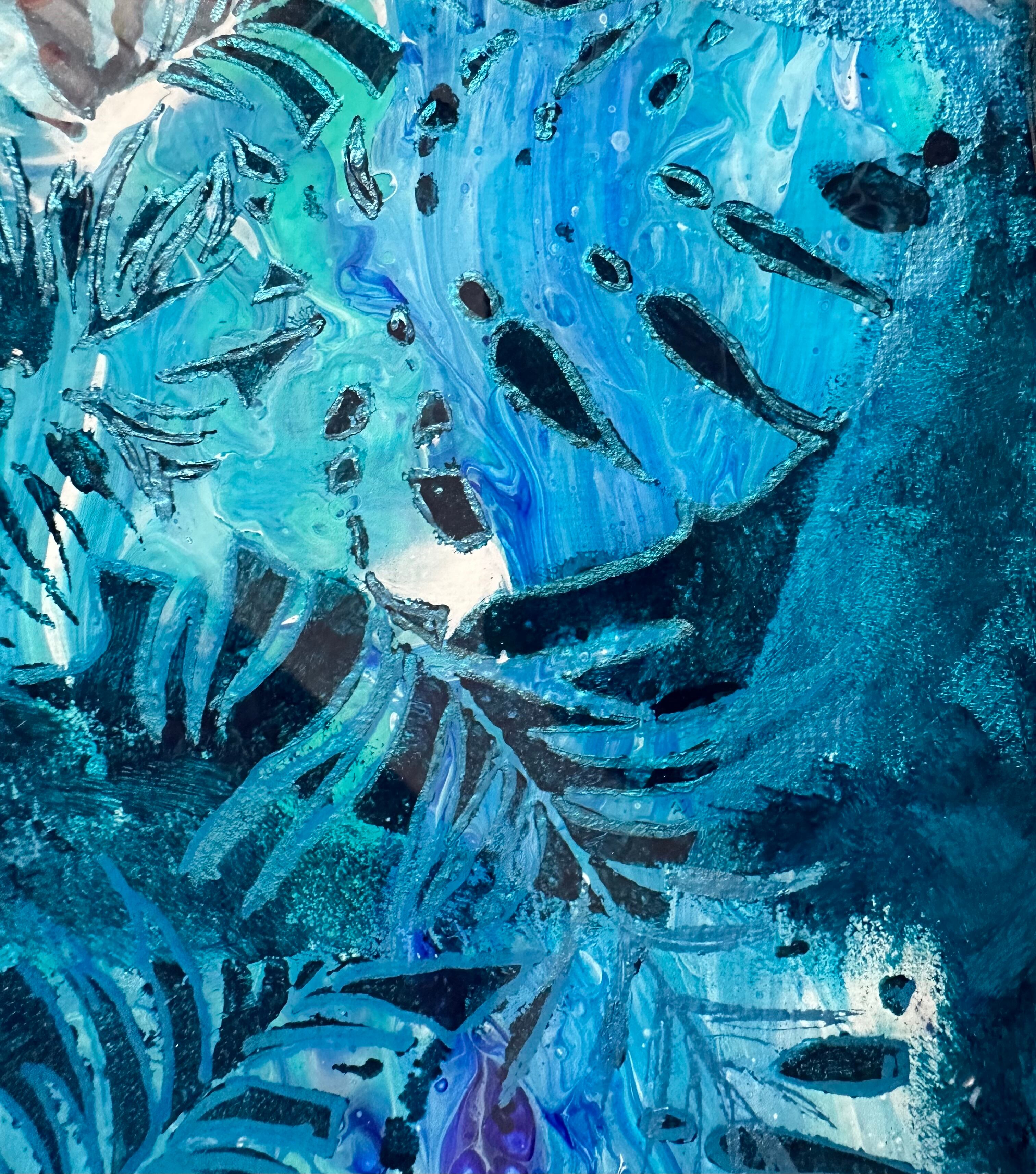ポーリングアート(フルイドアート)の上に絵を描いてありモンステラとヤシの葉の中に海アートが見えます