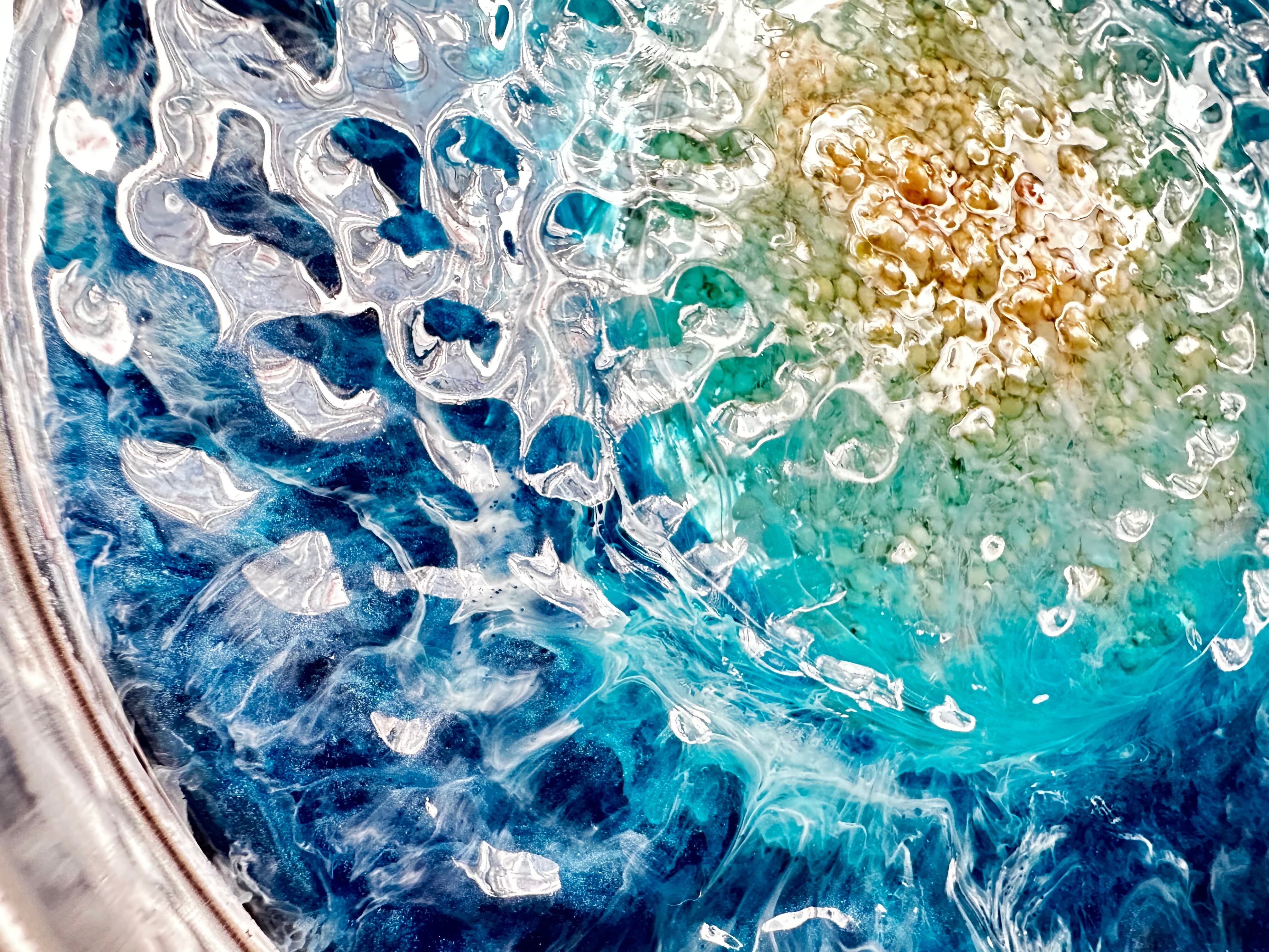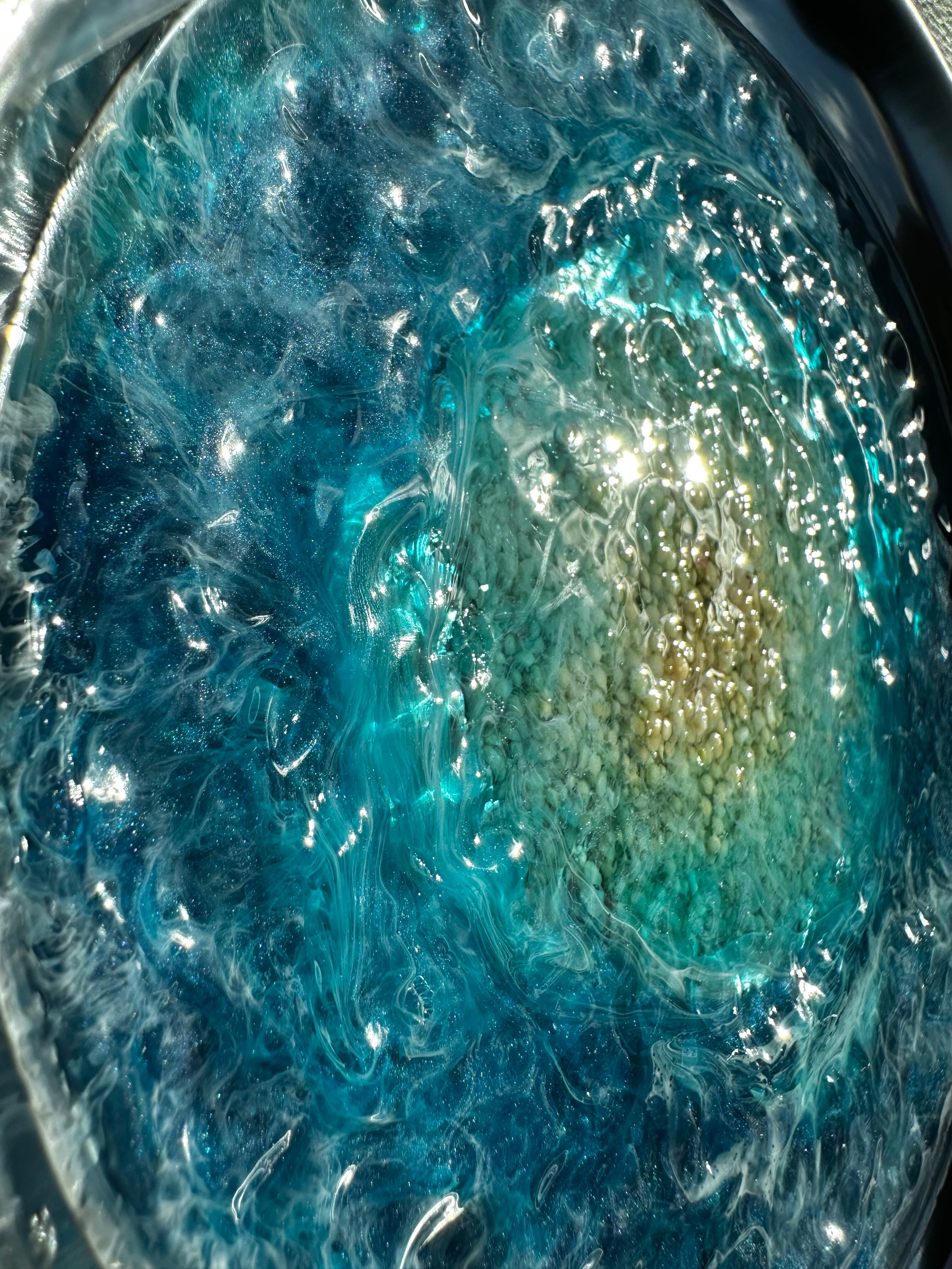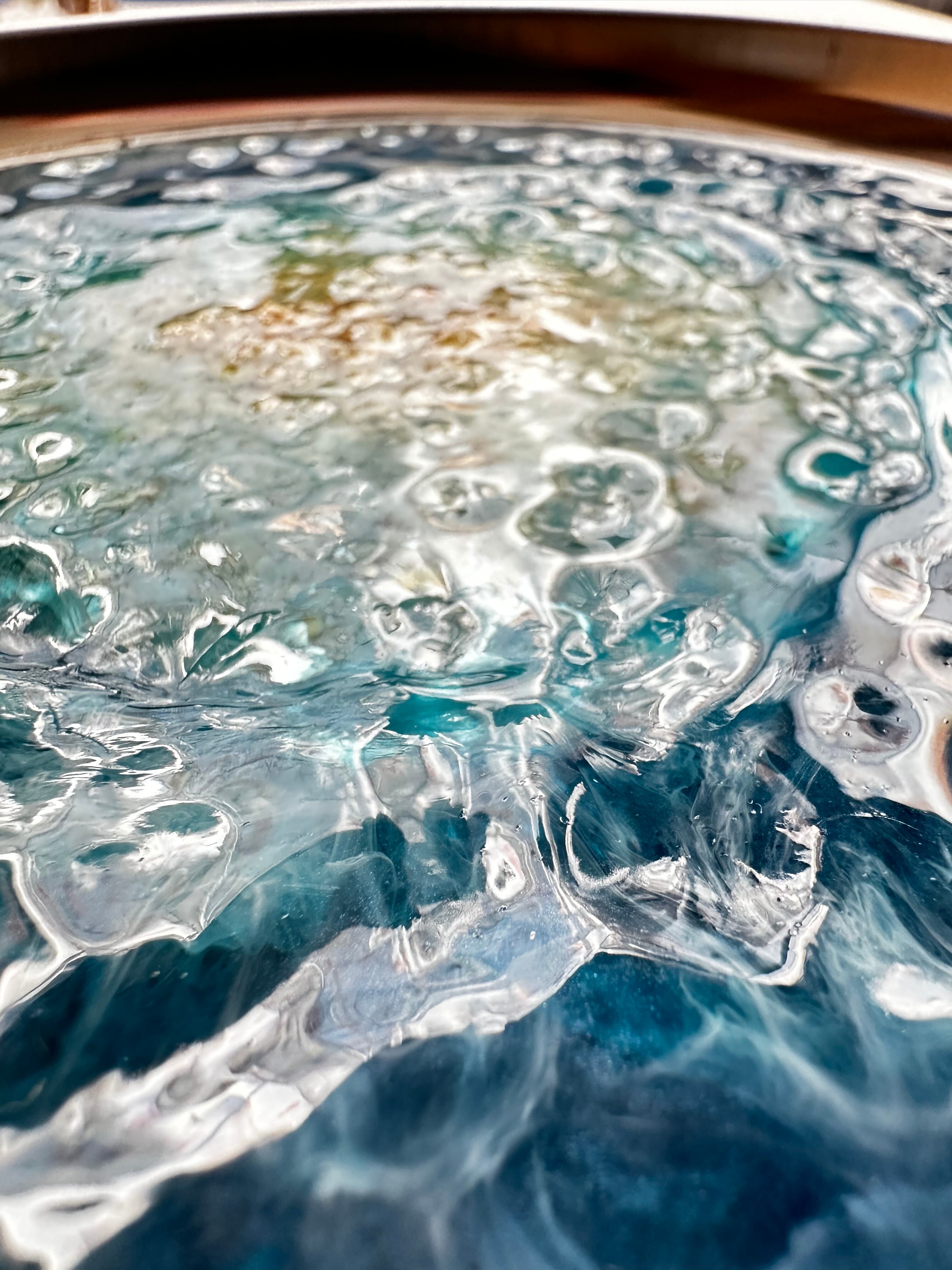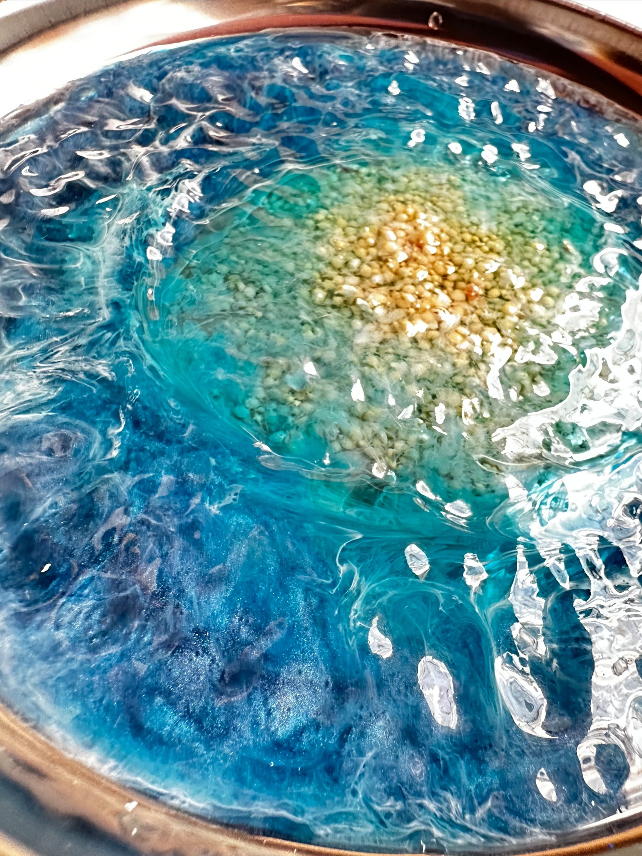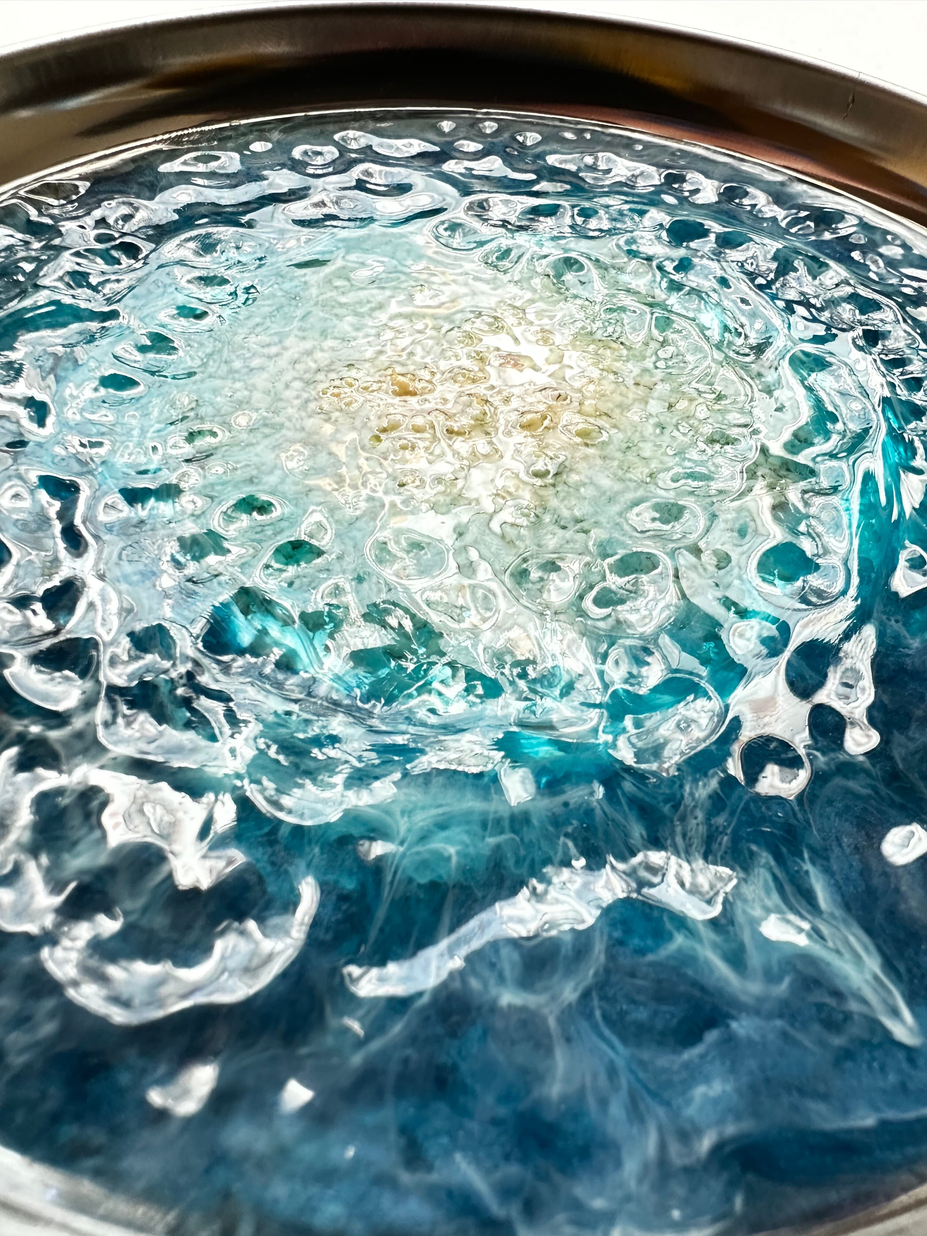 このキャッシュトレーは、職人の手によってひとつひとつ丁寧に作られました。製品には、鮮やかな色合いと透明感を持つエポキシ樹脂を使用しています。耐久性があり、傷や汚れにも強いため、長くお使いいただけます。